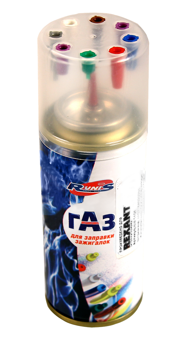 Газ для зажигалок Rexant, метал.баллон, 140мл. (8 переходников) предназначен для заполнения газовых зажигалок, а также других различных газовых приборов – ламп, обогревателей, светильников и т.п.
