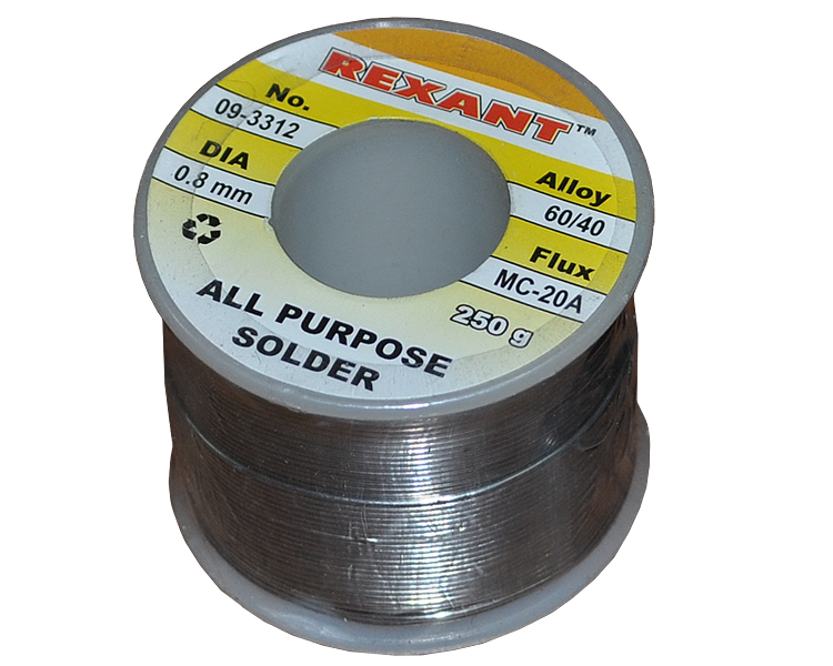 Припой с канифолью 250 г Rexant представляет собой проволоку (диаметром 0,8 мм) из сплава олова (60%) и свинца (40%). Используется в пайке для соединения деталей между собой и позволяет создать герметичный, механически прочный (устойчивый) шов. Нагреваясь до температуры плавления (183-188 С) припой: расплавляется, смачивает спаиваемый металл и, растекаясь по нему - заполняет место между соединяемыми деталями.