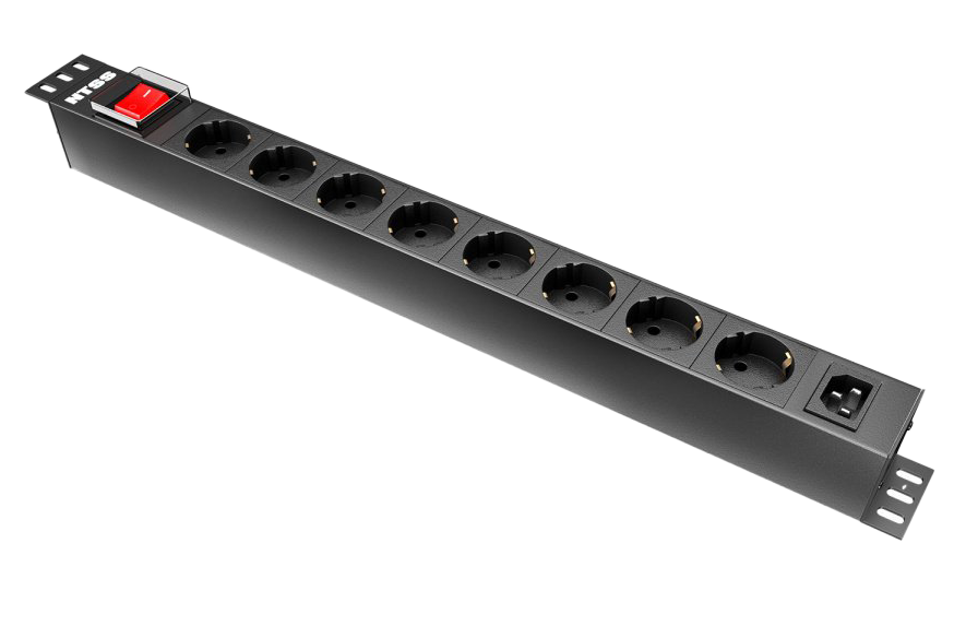 Блок силовых розеток 19" без шнура горизонтальный; с выключателем; вход IEC C14; 8 розеток Schuko; пластиковый корпус; 1U; U-ном. 230 В/50 Гц, P-потр. max 3,7 кВт, I-ном. 10 А; IP20; цвет черный; вход 60320 С14; размеры (ВхШхГ) 45х483х45 мм