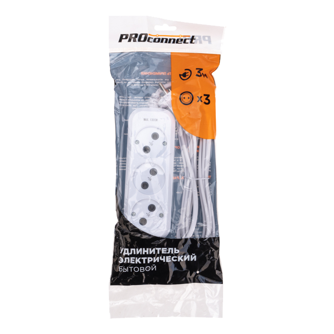 Удлинитель 3 гнезда 2 х 0.75 мм Proconnect, б/з, белый, 3 м для подключения электрических приборов и электроинструментов в быту, когда недостаточно стандартной длины шнура для питания от стационарных розеток.